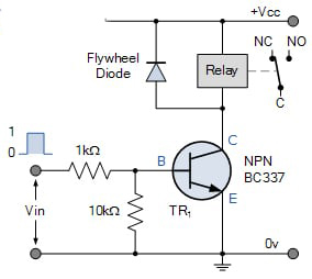 Here in this circuit, we have selected NPN type BJT transistor BC337. This transistor is connected in common emitter mode and 1KΩ resistor is the base resistor used to control the base current . The 10KΩ resistor is used to tie the Base of BC337 to ground (GND) so that when trigger at input positive edge trigger is given, then the transistor will go in saturation and conducts through Collector and Emitter to short the GND to Relay coil. Hence Coil will energize and Normally Close (NC) the contacts of Relay.